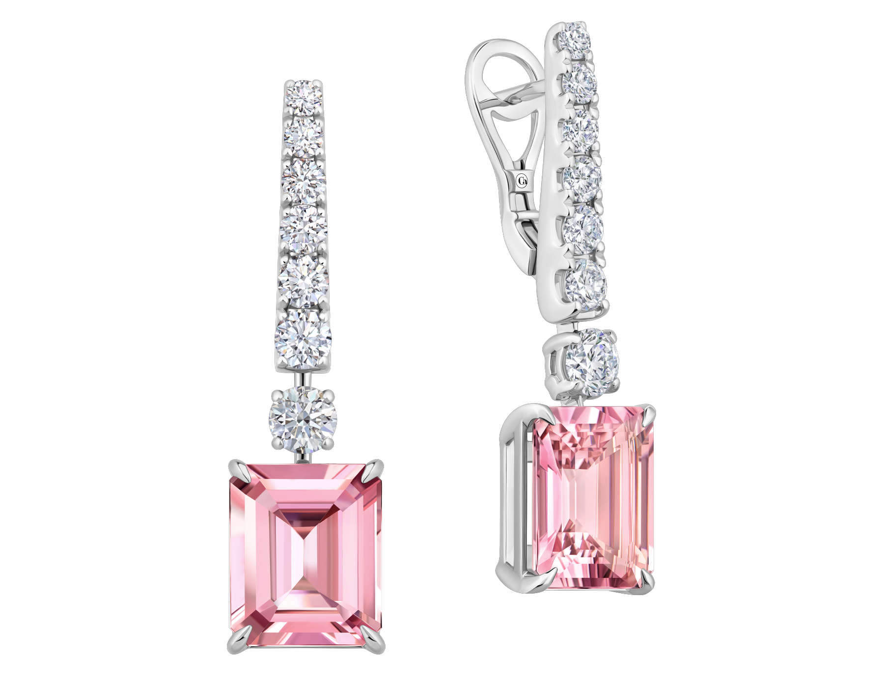 Серьги с морганитом из коллекции Classic представляют изысканную ювелирную композицию. В центре внимания – два морганита благородно-розового оттенка весом более 9 карат. Ступенчатая огранка подчеркивает нежное мерцание солирующих камней. Четырнадцать бриллиантов придают серьгам торжественности. Классический дизайн позволяет интегрировать украшение в дневные и вечерние образы.