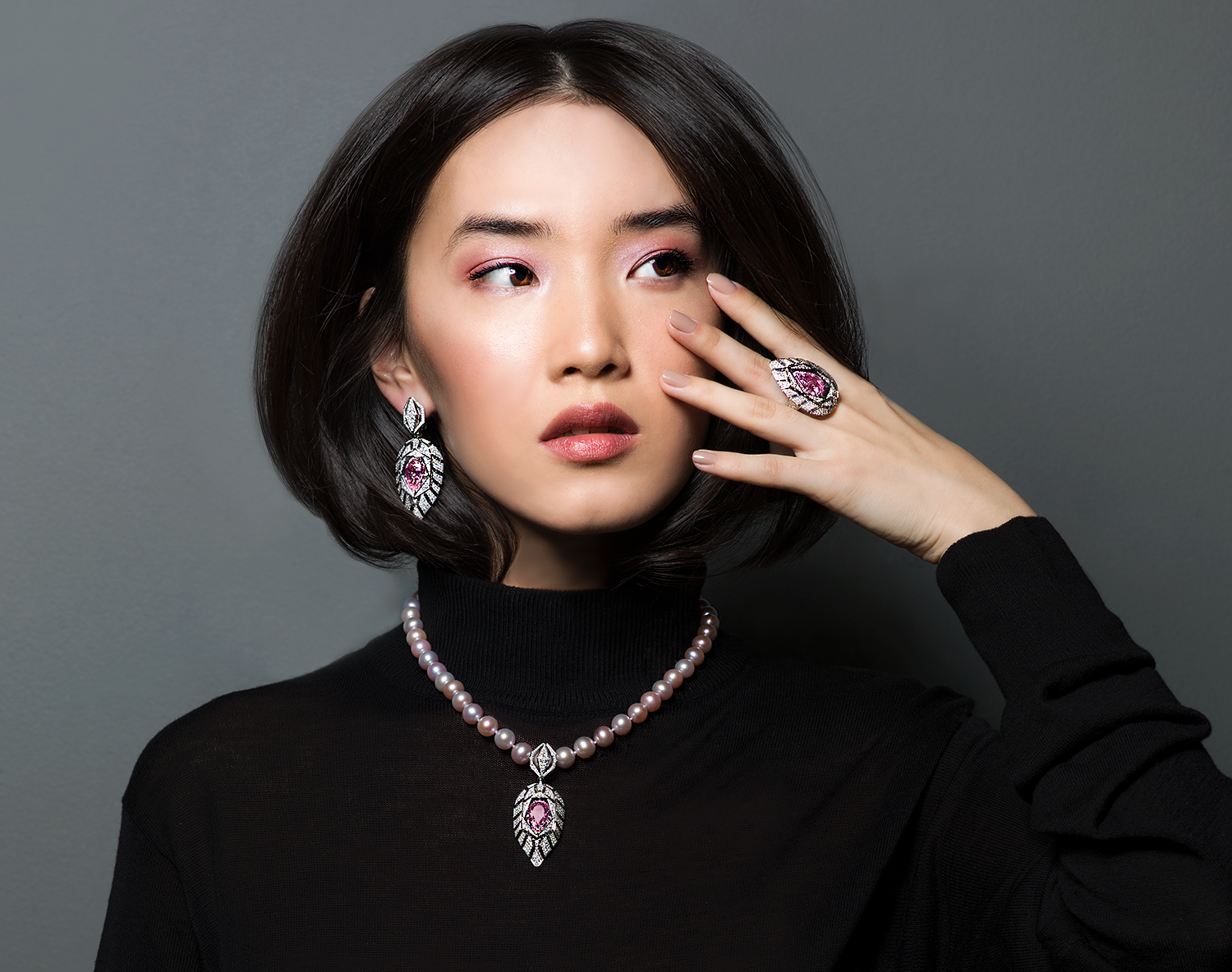 В парюре «Сингапур» прослеживаются черты современной азиатской архитектуры. Премиальные морганиты цвета утренней зари и лавандовый жемчуг соединяют традиции и технологии. Запатентованный механизм в серьгах «Сингапур» позволяет подобрать идеальное положение украшения относительно овала лица обладательницы.