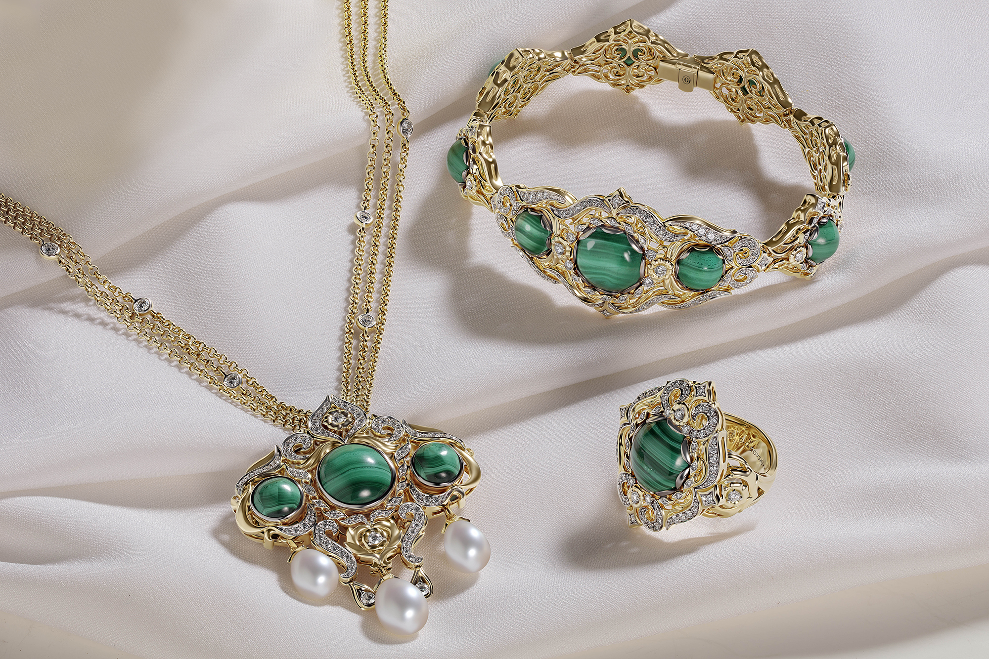 В коллекцию вошли парюры «Александра Федоровна» с малахитом, бриллиантами и жемчугом, а также «Мария Федоровна», центральным камнем для которой был выбран лазурит. В XIX веке малахитовое дело России обрело мировое признание, русские мастера изумляли масштабами своих работ. Два столетия спустя малахит вновь оказался в центре внимания — тренд на сочетания поделочных и драгоценных камней поддерживают ведущие ювелирные дома во всем мире. Актуальность художественного решения выражается также в возможности трансформации украшений.