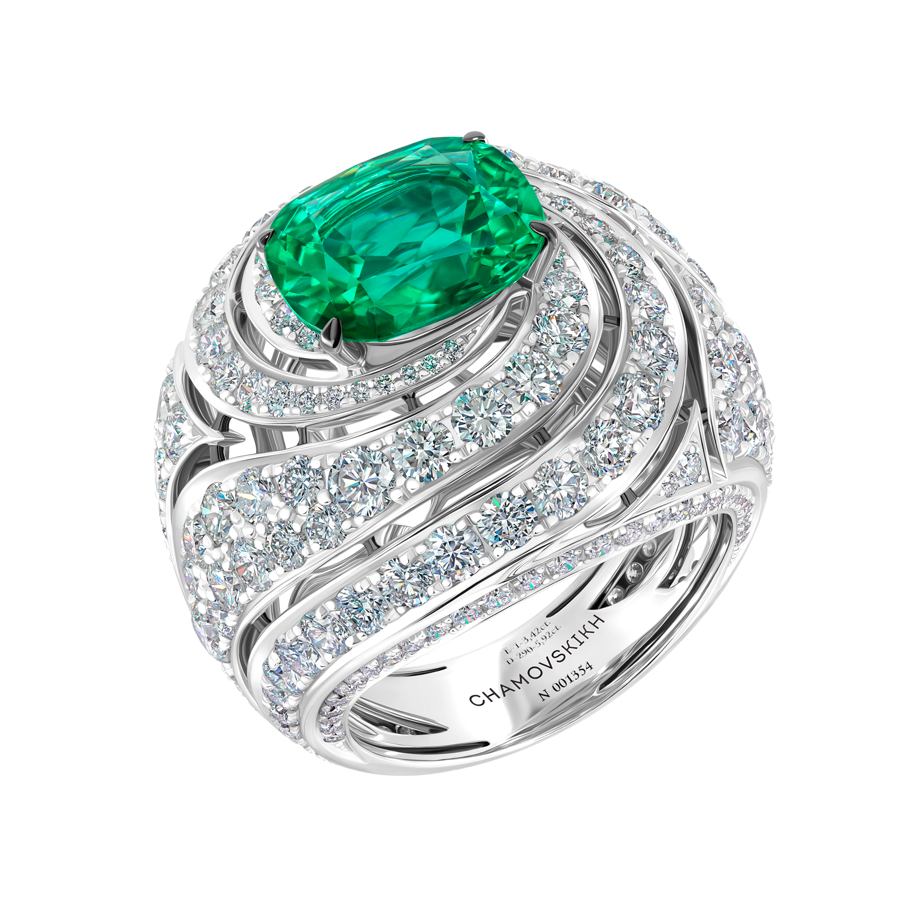 В эффектном кольце «Чалма» вихрь из 290 бриллиантов приковывает внимание к уникальному уральскому изумруду весом 3,4 карата огранки «кушон» насыщенного цвета и высокой чистоты.