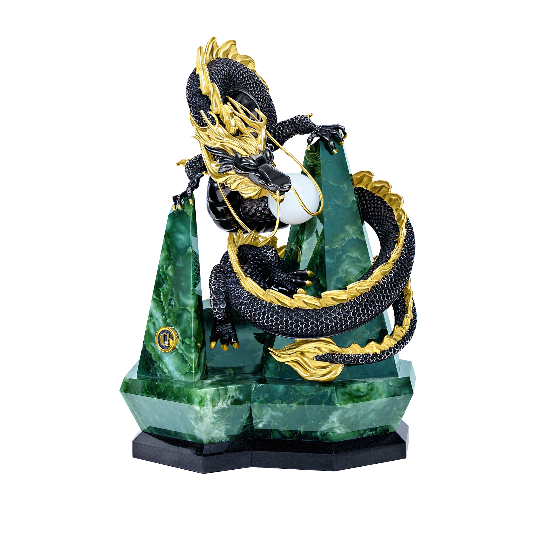 Согласно древнему преданию, дракон – страж несметных сокровищ, главным из которых является волшебная жемчужина. Она – неоскудевающий источник благополучия для каждого, кто станет ее владельцем. Пластика серебряного «Дракона» передает его огромную внутреннюю энергию. Фактура чешуи и покрытые чистым золотом рога, когти и гребень эффектно отражаются на полированной поверхности священного в культуре Азии камня – нефрита.