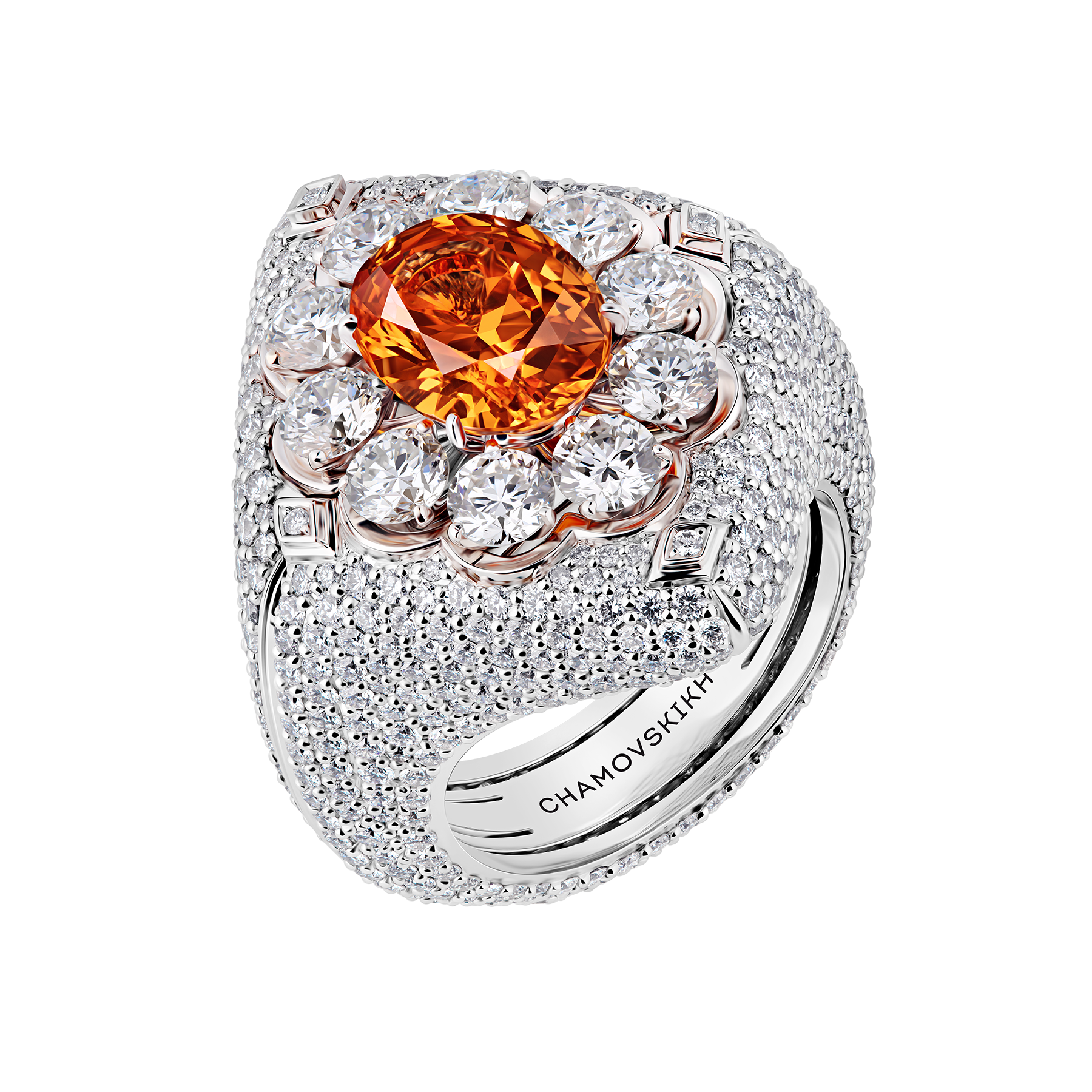 Превосходные спессартины сияют в центре концептуального сета «Княжна», окруженные паве из сотен превосходных бриллиантов. Великолепное коктейльное кольцо и удлиненные серьги обладают возможностью трансформации, что позволяет носить их в различных вариациях.