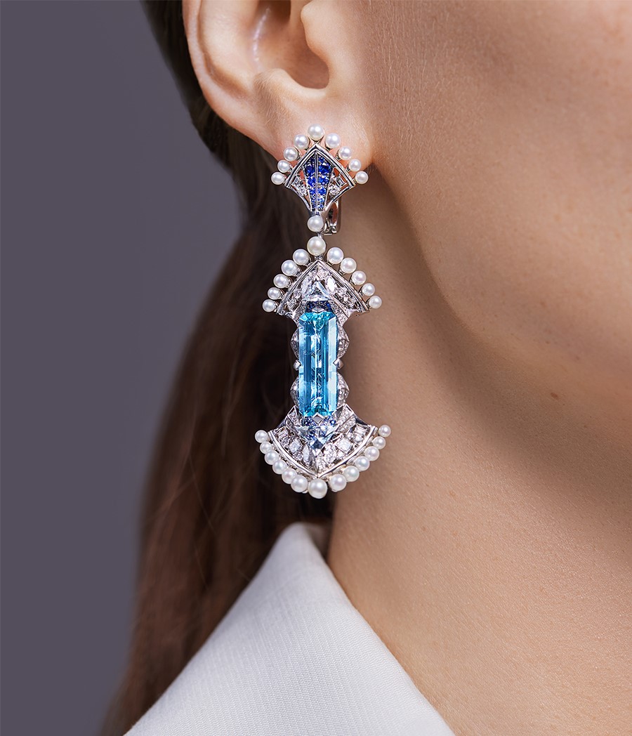 Наконец, зима воплощает кристаллизованную холодную красоту и завершение цикла. Серьги с аквамаринами и жемчугом передают эту снежную тишину, сокрытую в безупречно-чистых, словно арктический лед, голубых самоцветах, мягком мерцании жемчужин и ослепительном блеске бриллиантов. Геометричная форма аквамаринов, соединяясь с драгоценными ажурными узорами, создает сказочный и невероятно стильный образ.