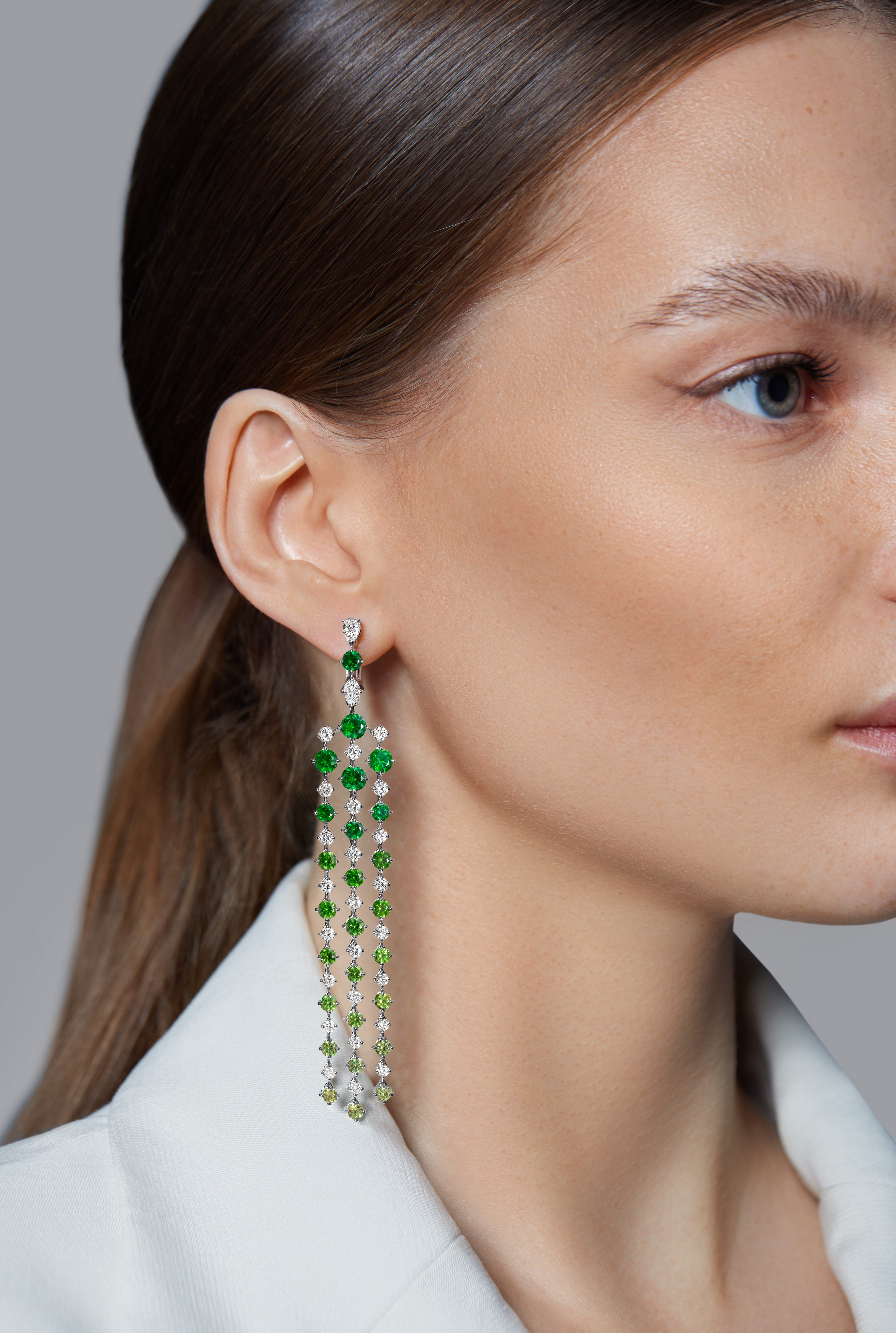 Весна, лето, осень и зима — постоянные метаморфозы в цикле времен года. Калейдоскоп красок распускающихся цветов, теплые объятия знойного летнего солнца, багряные оттенки осенней листвы и ослепительная белизна морозного снега, все это — выразительные и эфемерные явления, которыми можно наслаждаться только в определенный сезон, нашедшие отражение в украшениях Chamovskikh. Мягкие зеленые тона демантоидов в классических серьгах напоминают оттенки молодой листвы, символизируя новые начинания, обновление и радость.