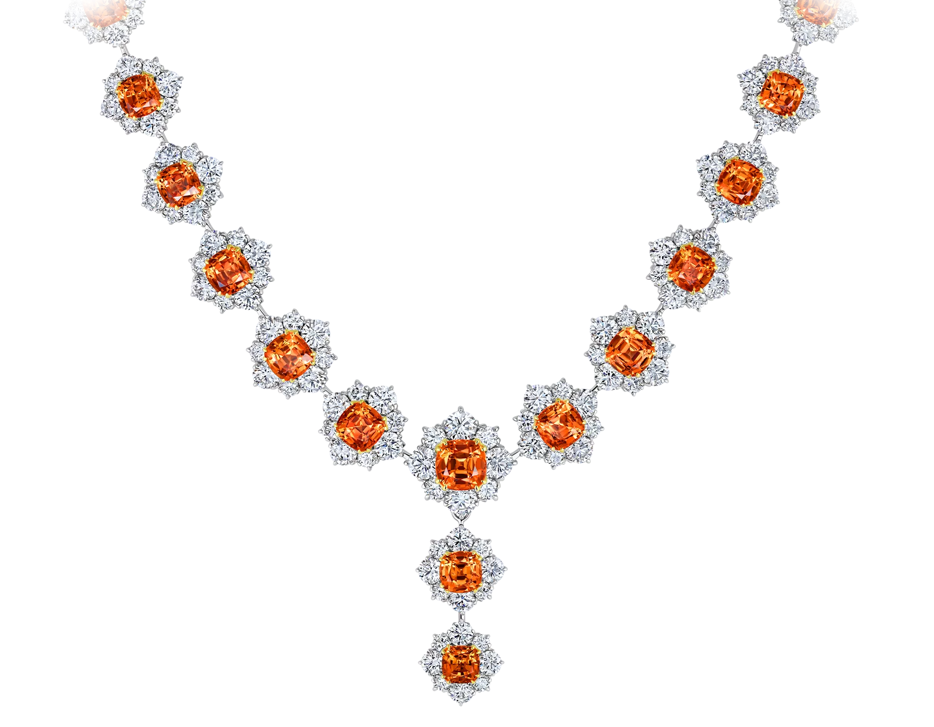 Тридцать редких мандариновых спессартинов общим весом более 60 карат в сочетании с 240 бриллиантами создают привлекательный акцент в классическом колье. Изысканная огранка «кушон» раскрывает завораживающий оттенок самоцвета, рождающего яркий ювелирный образ для самых значимых событий.
