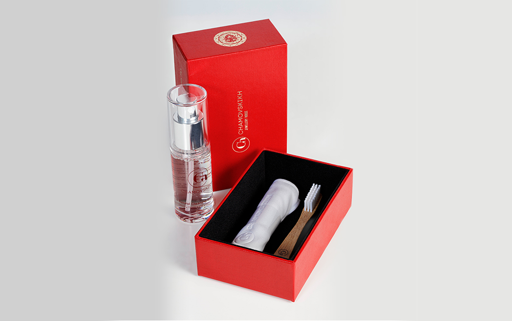 - аккуратно очистите металл с помощью щеточки из фирменного набора по уходу за драгоценностями от CHAMOVSKIKH, особое внимание уделяя труднодоступным местам;
