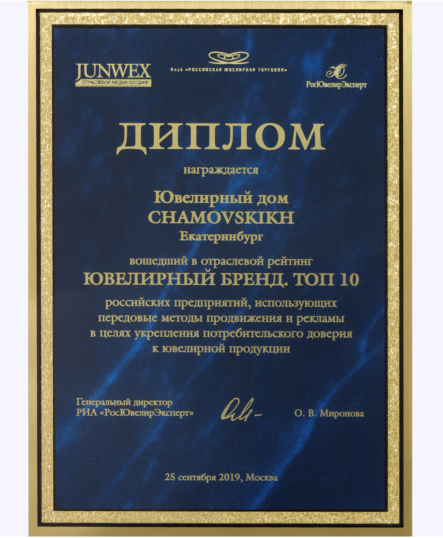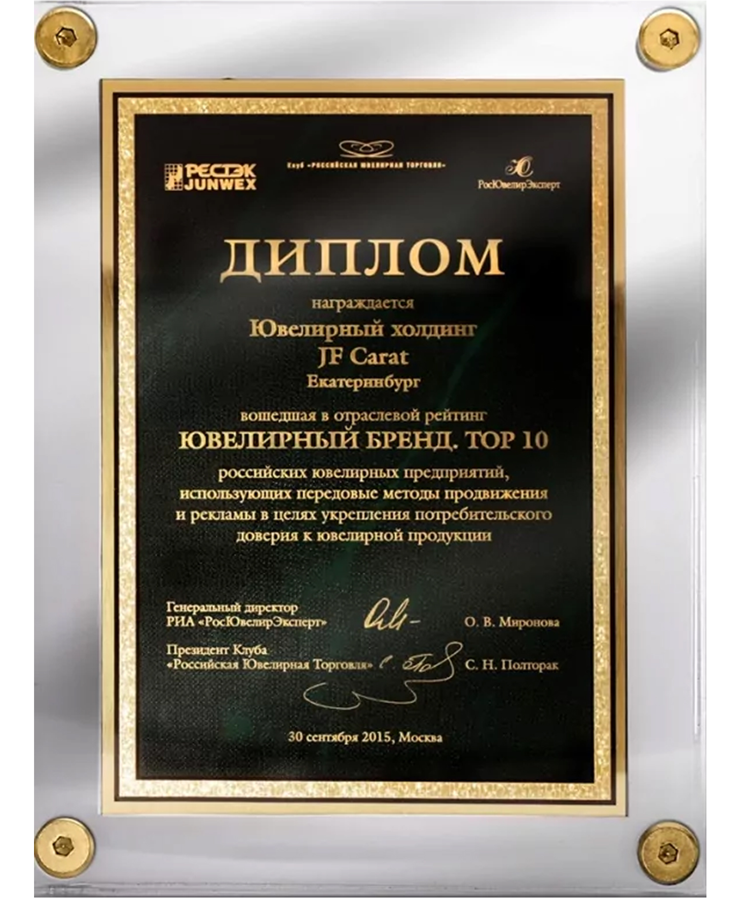 Диплом и награда от журнала Jewelry Garden и ассоциации "Национальные ювелирные бренды России" в номинации "Настоящие инвестиции!"