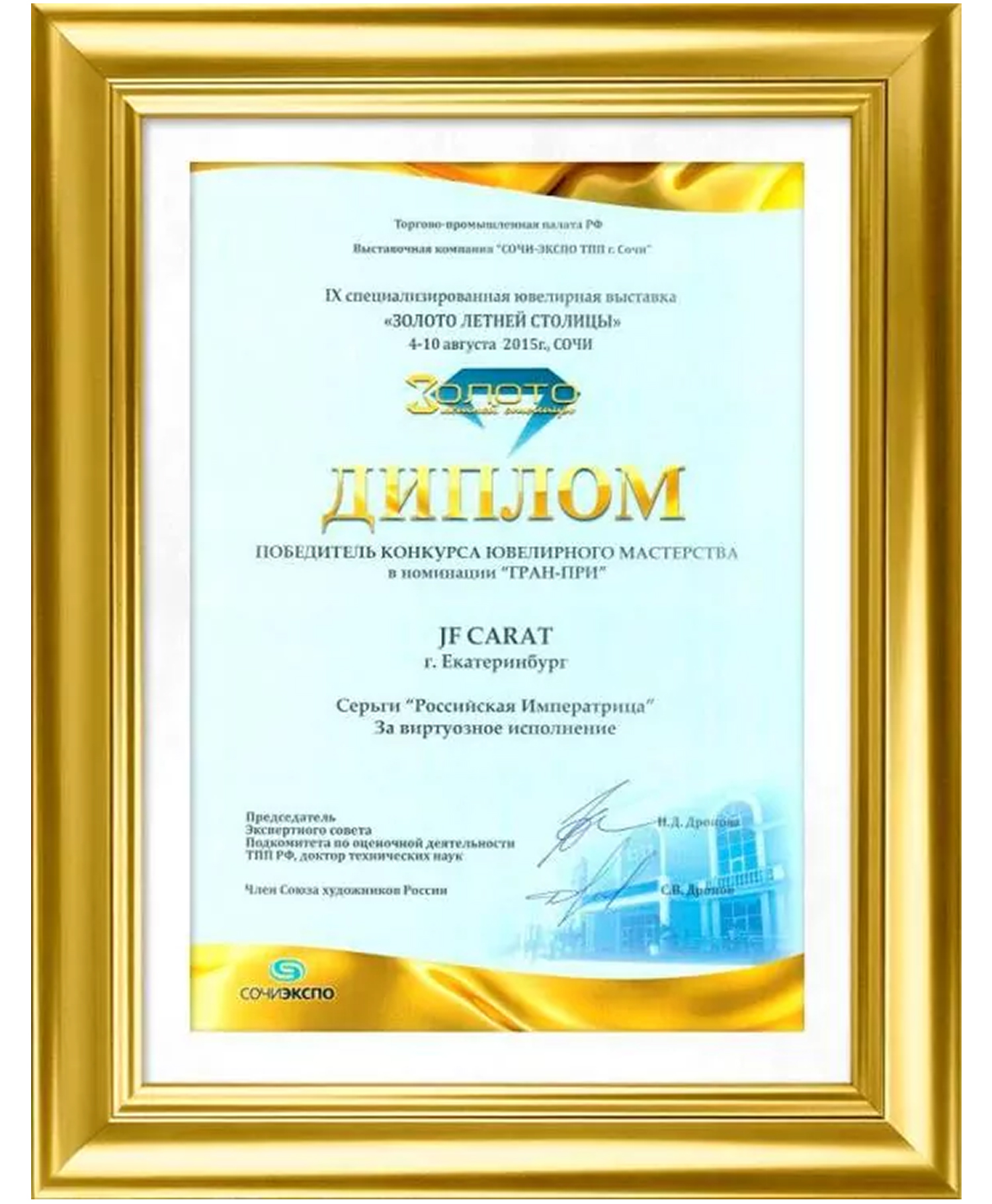 Диплом победителя конкурса "Алтын Барс". Гран-при выставки "ЮвелирЭкспо" 2015 г. Серьги "Российская Императрица"