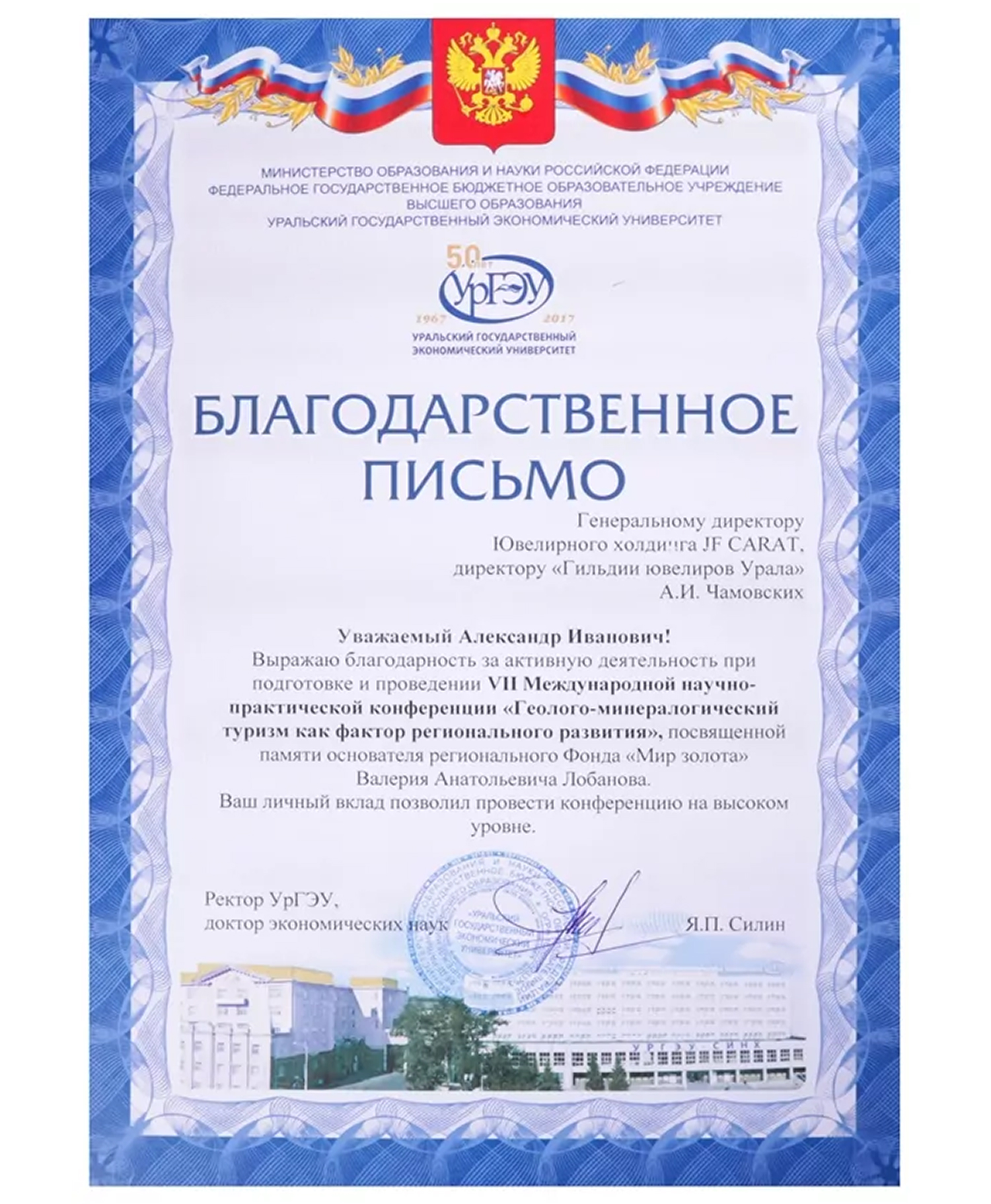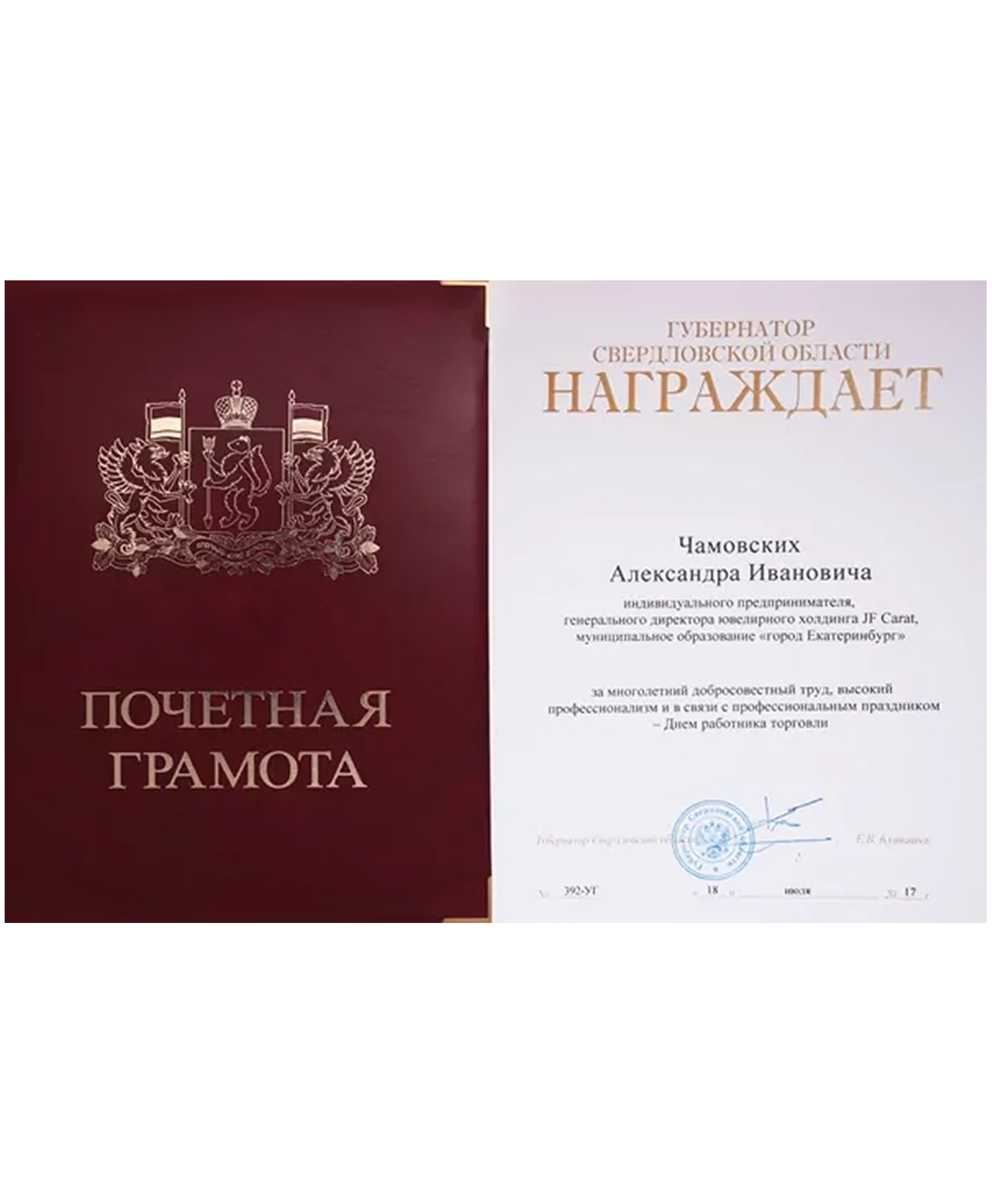 Награда Чамовских А.И. от Оргкомитета Программы "Ювелирная Россия".