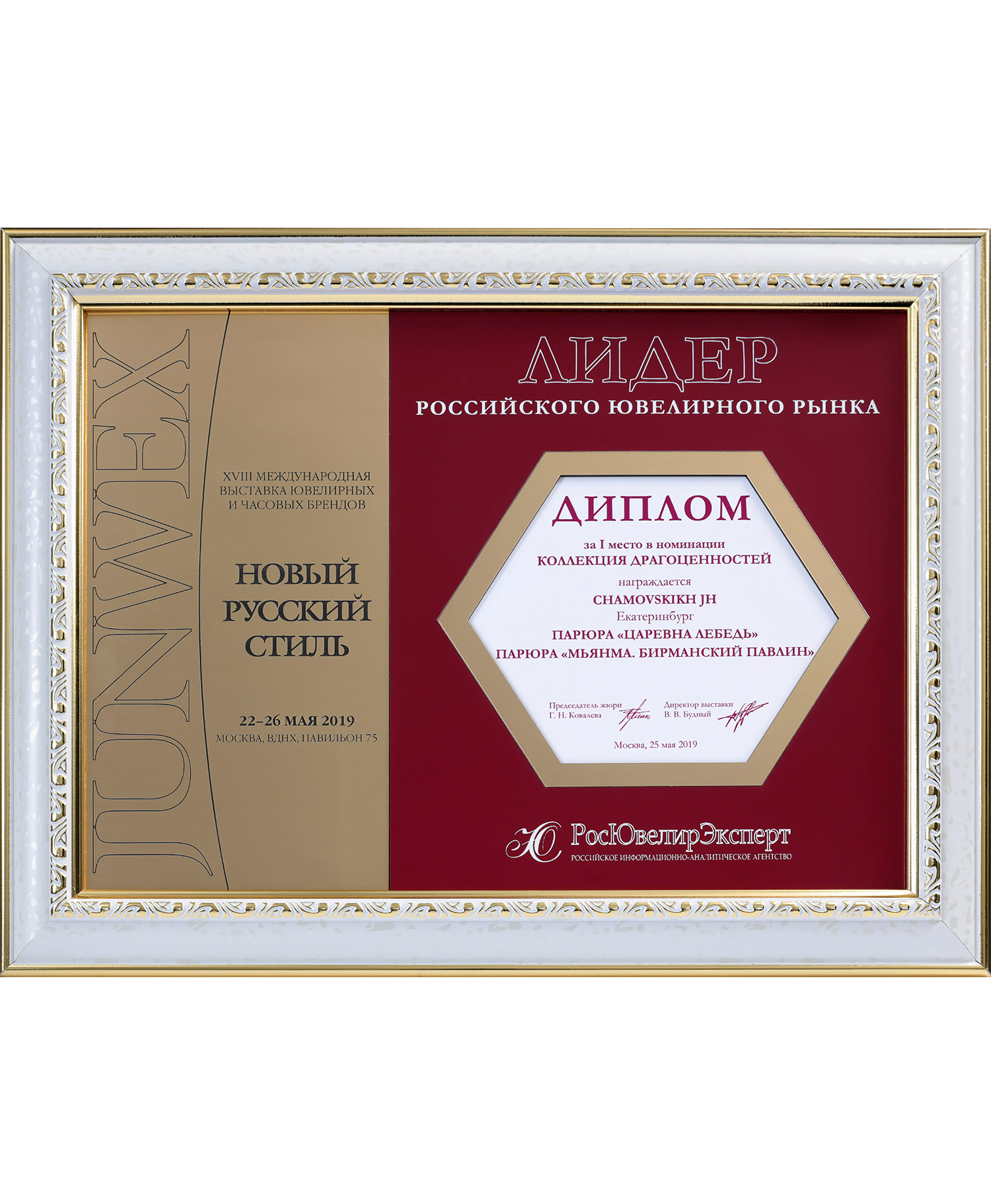 Диплом JUNWEX Москва - 2019 за 1 место в номинации "Коллекция драгоценностей". Парюра "Царевна Лебедь", парюра "Мьянма. Бирманский павлин"