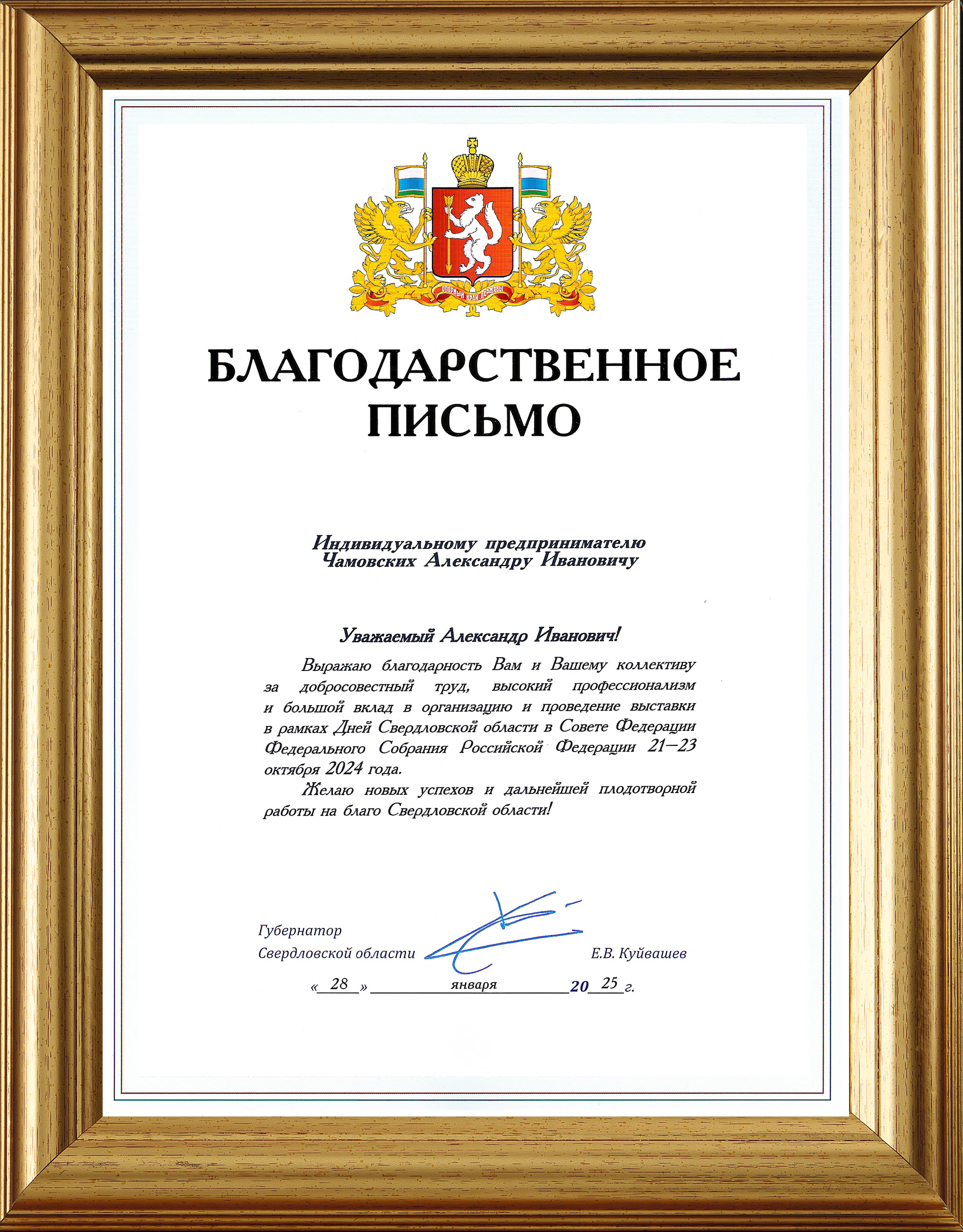 Благодарственное письмо от Свердловского областного Союза промышленников