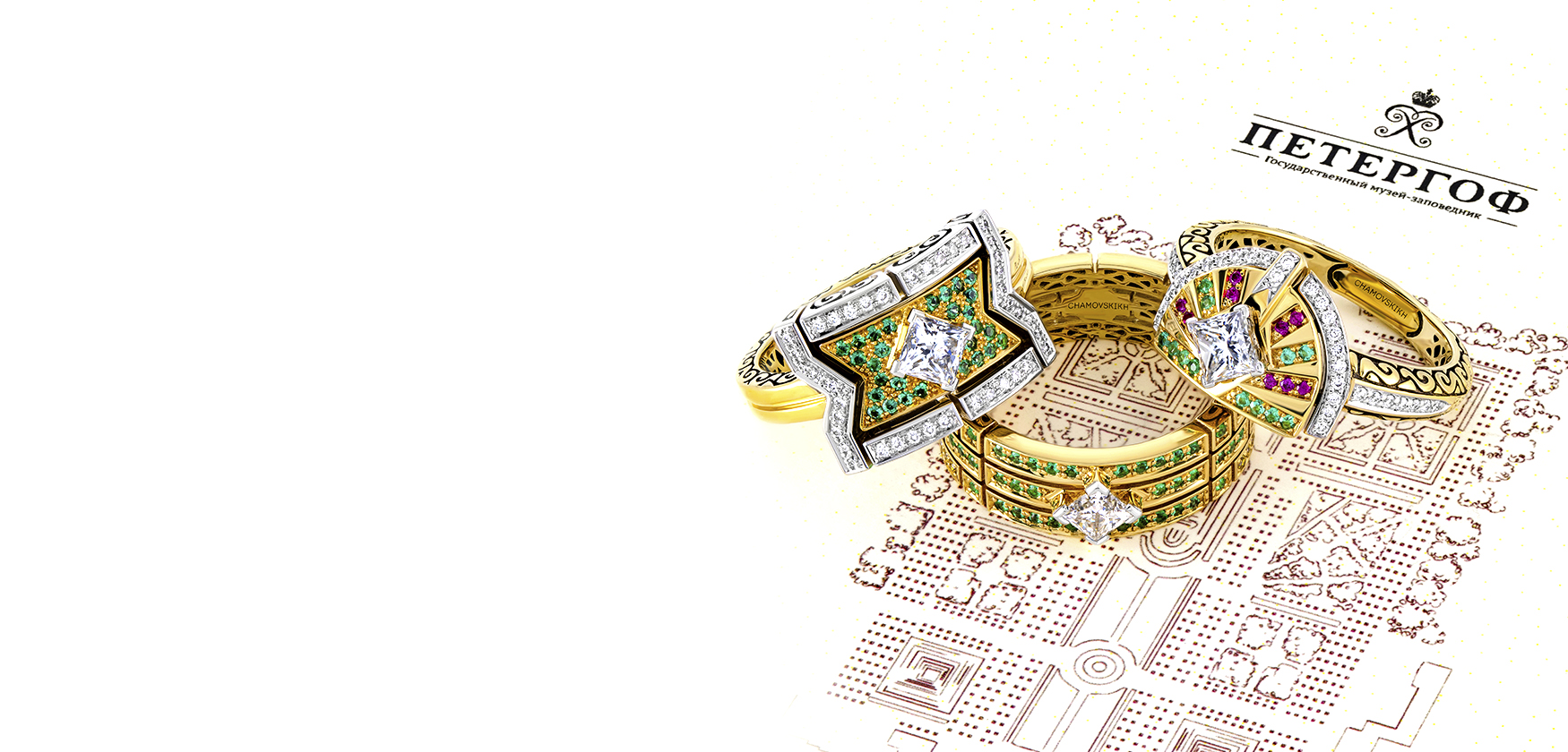 Уникальный ювелирный проект «Петергоф» не имеет аналогов по своему масштабу, концептуальности и искусному исполнению. Двадцать элементов гарнитура составляют мозаичную композицию, передающую панорамный вид Петродворца через строгую геометрию сапфировых водоемов, изумрудных парков, рубиновых садов и бриллиантовых фонтанов. Эта лимитированная коллекция представляет собой инновационную ювелирную интерпретацию символа и архитектурного чуда России. Все украшения выполнены эксклюзивно в рамках проекта и не предназначены для продажи.