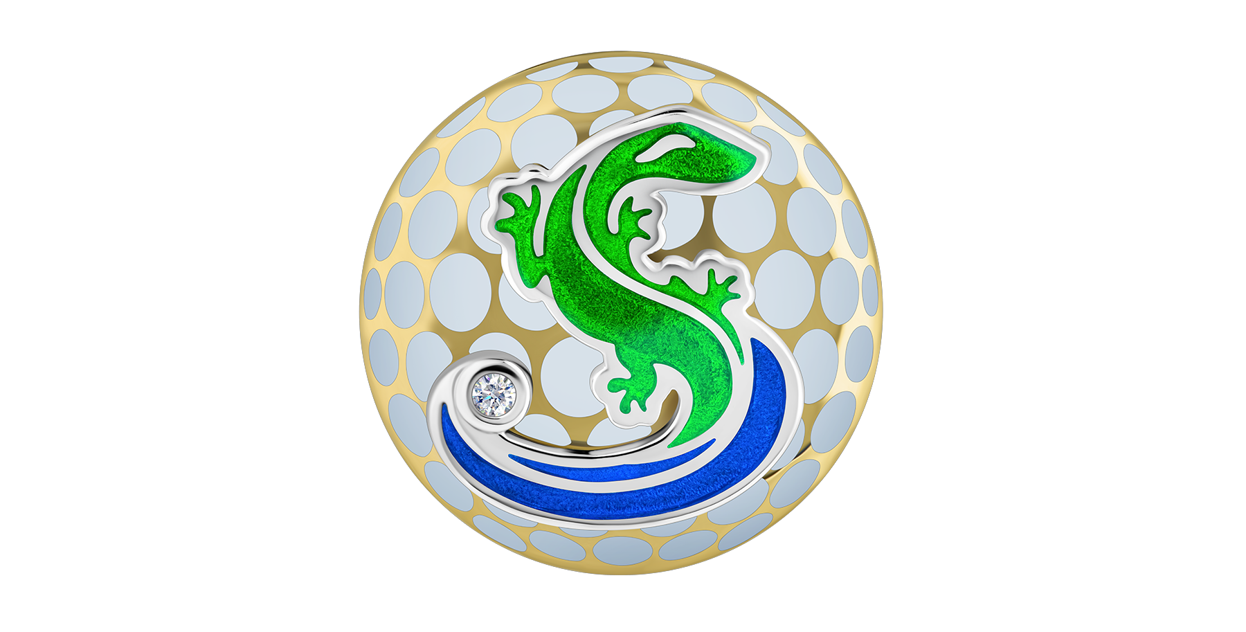 Форма и фактура ассоциируется с одним из главных атрибутов игры — мячом для гольфа. Эмблема клуба выполнена с использованием современной нанокерамической эмали синего и зеленого цветов. Аристократичную историю гольф-спорта подчеркивает природный бриллиант превосходных характеристик классической круглой огранки.