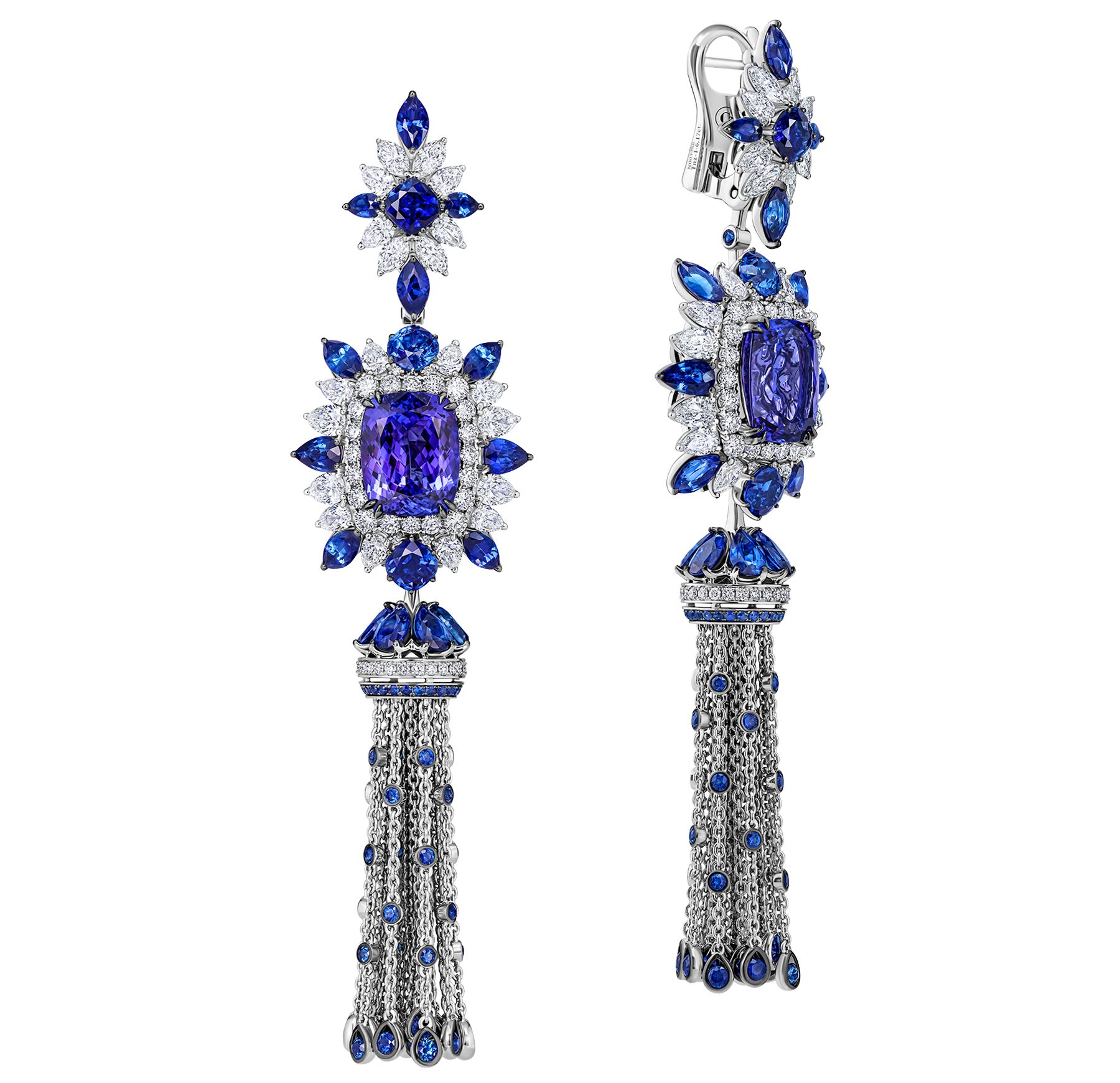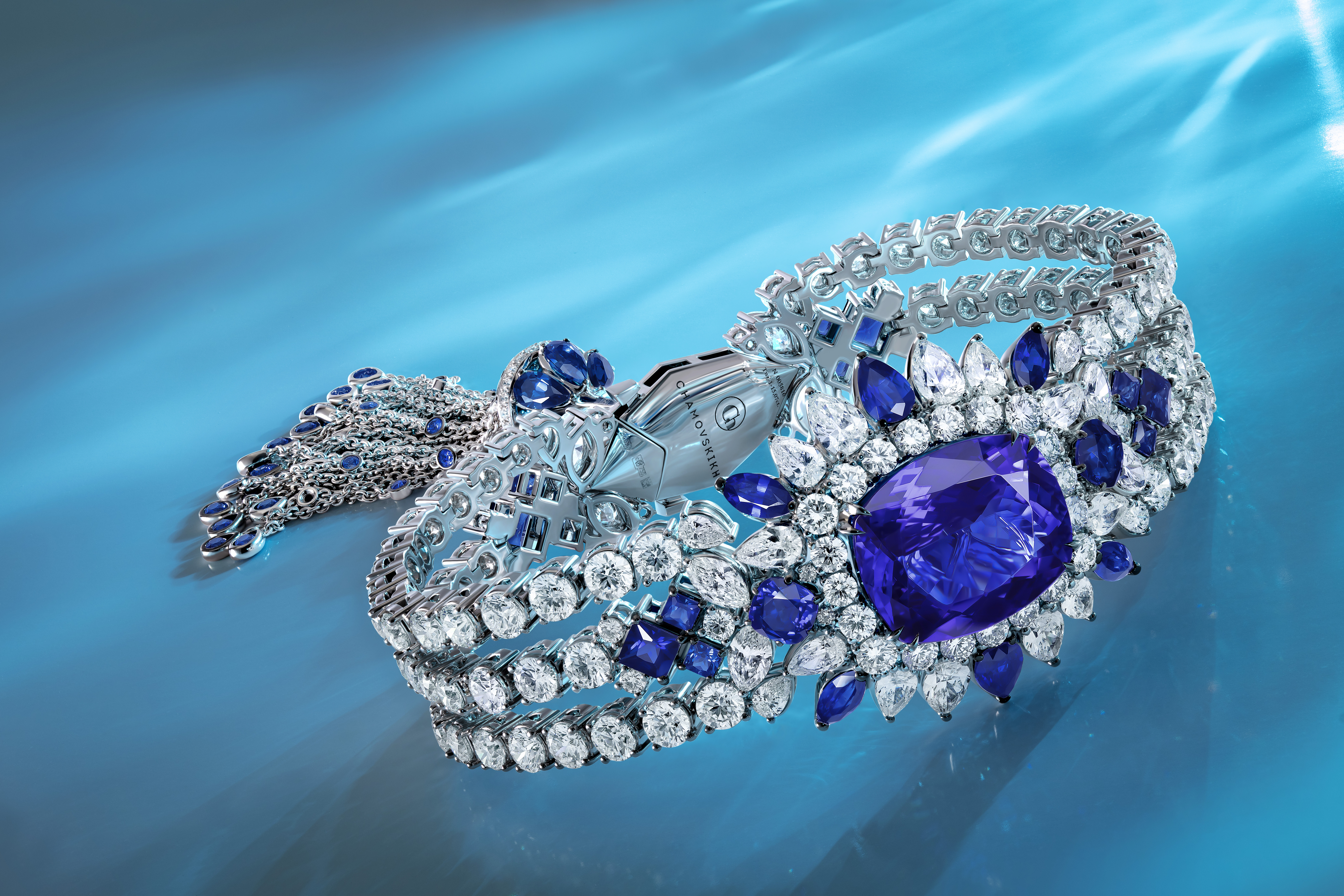 Харизматичный образ, вдохновленный японской мифологией и культурой, выстраивается вокруг солирующих камней — уникальных танзанитов огранки Cushion. Премиальный оттенок самоцветов Violetish Blue подчеркивают сотни природных сапфиров и превосходных бриллиантов. Драгоценные камни классической и фантазийных форм соединяются в безупречную ювелирную композицию, оригинальным завершением которой в каждом предмете сета является драгоценная кисть. Подвижный подвесной элемент, инкрустированный сияющими бриллиантами и яркими сапфирами, напоминает хвост мифического дракона Рюдзина, охраняющего, согласно японским легендам, морские глубины и повелевающего океаном.